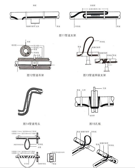 電熱帶安裝時應注意,保證電熱帶芯帶最大接觸面積緊貼附件。切勿扭折,保證熱傳遞正常。以上安裝可以通過鋁箔膠帶增大受熱面積,確保伴熱效果。以下為附件安裝示意圖: