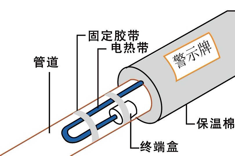 在以上電伴熱系統(tǒng)安裝調(diào)試完畢后,需做外保溫層,請選擇阻燃防火型的外保溫層,在保溫層外加警示標(biāo)簽注明“內(nèi)有電熱帶”更需注明所有配件的位置.,以便于今后電熱帶接線方式的檢查和維護(hù)。