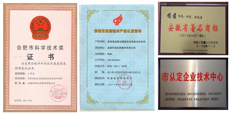 安徽環(huán)瑞擁有21項(xiàng)自主知識(shí)產(chǎn)權(quán),其中包括:2項(xiàng)國(guó)家發(fā)明專利;4項(xiàng)新型電伴熱帶、發(fā)熱電纜生產(chǎn)核心技術(shù)(1、雙層共擠技術(shù),2、束代絞預(yù)恒張力絞線,3、一體化熱線冷線隱式拼接,4、三層共擠技術(shù));5項(xiàng)核心新型產(chǎn)品(1、具有低電阻過(guò)渡層的電伴熱帶,2、一種安全塑料體的電伴熱帶,3耐高溫耐磨的發(fā)熱電纜,4、太陽(yáng)能熱利用電伴熱帶,5、新型長(zhǎng)距離并聯(lián)、串聯(lián)恒功率電熱帶);10項(xiàng)行業(yè)專用電伴熱帶(消防專用電伴熱帶、電廠煙氣脫硫?qū)S秒姛釒А⑻?yáng)能熱水器本質(zhì)安全型電熱帶、石油管道伴熱專用電熱帶、汗蒸房專用電熱帶、天溝融雪專用發(fā)熱電纜、混凝土養(yǎng)護(hù)專用發(fā)熱電纜、畜牧養(yǎng)殖專用發(fā)熱電纜等)。安徽環(huán)瑞憑借此項(xiàng)榮譽(yù)獲得了省科學(xué)技術(shù)獎(jiǎng)、高新技術(shù)產(chǎn)品證書(shū)及國(guó)家地暖行業(yè)、省建設(shè)廳榮譽(yù)推廣證書(shū)。