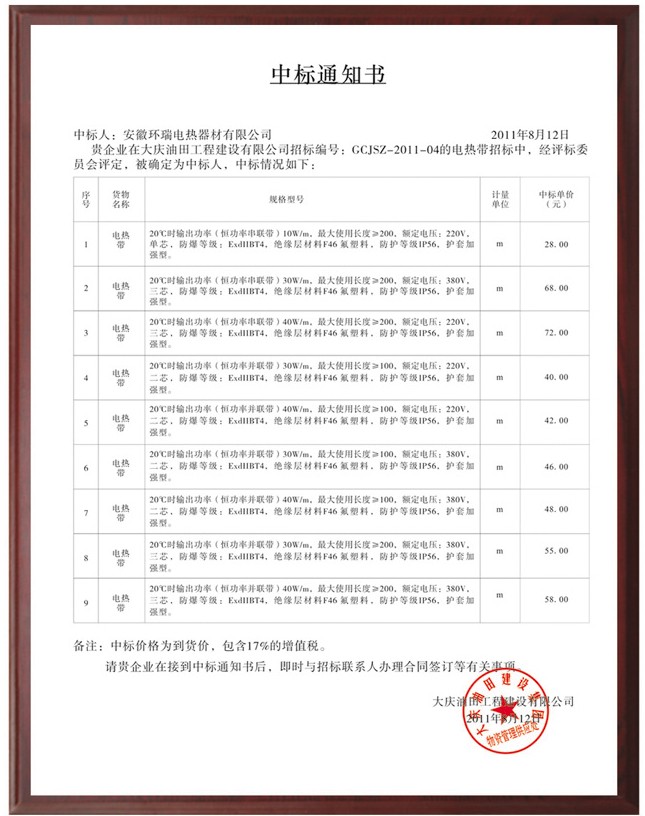 喜報(bào)!安徽環(huán)瑞在總公司領(lǐng)導(dǎo)的關(guān)懷下、在以優(yōu)秀經(jīng)理徐紅兵同志為帶領(lǐng)的大慶辦事處全體員工的辛勞下,經(jīng)過不懈努力,在與全國(guó)各地20余家同行業(yè)企業(yè)的競(jìng)爭(zhēng)中,脫穎而出,于2011年7月30號(hào)拔得頭籌,中標(biāo)成功!成為大慶油田建設(shè)集團(tuán)卓越中標(biāo)單位、大慶油田石油管理局入網(wǎng)單位!