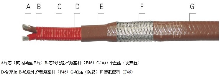 電源母線為二根平行絕緣銅線,在絕緣層中間纏繞電熱絲,并將該電熱絲每隔一定距離(即“發(fā)熱節(jié)長(zhǎng)”)與母線連接,形成連續(xù)并聯(lián)電阻。母線通電后,各并聯(lián)電阻發(fā)熱,因而形成一條連續(xù)的加熱帶。