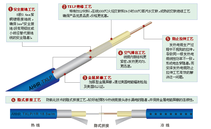 發(fā)熱電纜內(nèi)芯由冷線熱線組成,外面由絕緣層、接地、屏蔽層和外護(hù)套組成,發(fā)熱電纜通電后,熱線發(fā)熱,并在40~60℃的溫度間運(yùn)行,埋設(shè)在填充層內(nèi)的發(fā)熱電纜,將熱能通過熱傳導(dǎo)(對(duì)流)的方式和發(fā)出的8-13um的遠(yuǎn)紅外線輻射方式傳給受熱體。
