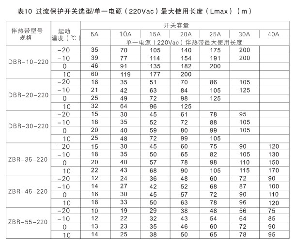 第三步: 根據表5,發現Lmax=67m,需5A開關,Lmax=136m需10A開關?,F熱線長度為L=120m,選10A開關足夠。
