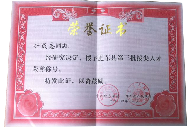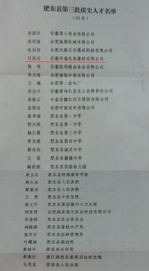 肥東縣委、縣政府為表彰環(huán)瑞公司對肥東縣當?shù)亟?jīng)濟發(fā)展所作的貢獻,特授予環(huán)瑞董事長計成志“肥東縣第三批拔尖人才”榮譽稱號。