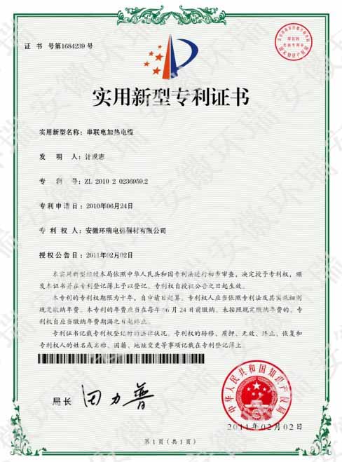 安徽環瑞串聯恒功率電伴熱帶國家電熱帶專利產品介紹